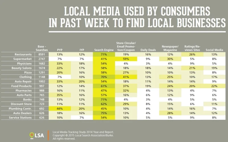 The data above looks at searches conducted in the past week. As has long been the case, restaurants were the most researched local category. Search engines were the leading media source used. However the chart reflects that search by itself is not enough. Multiple media are used by consumers and that the appropriate media mix will vary by category.