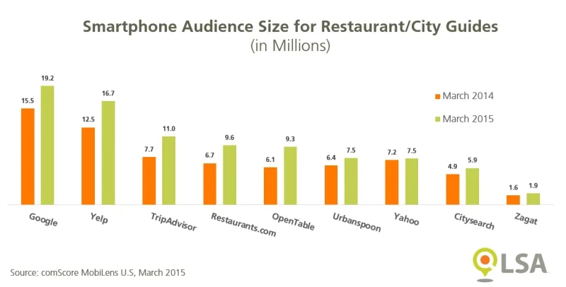 According to data from comScore, overall smartphone audience size in March 2015 for restaurant and city guides has grown nearly 30% compared to March 2014. While the growth rate varied by venue, the overall trend among these local search sites parallels what we saw earlier this year: consumers are using mobile devices more than PCs to find local/offline information.