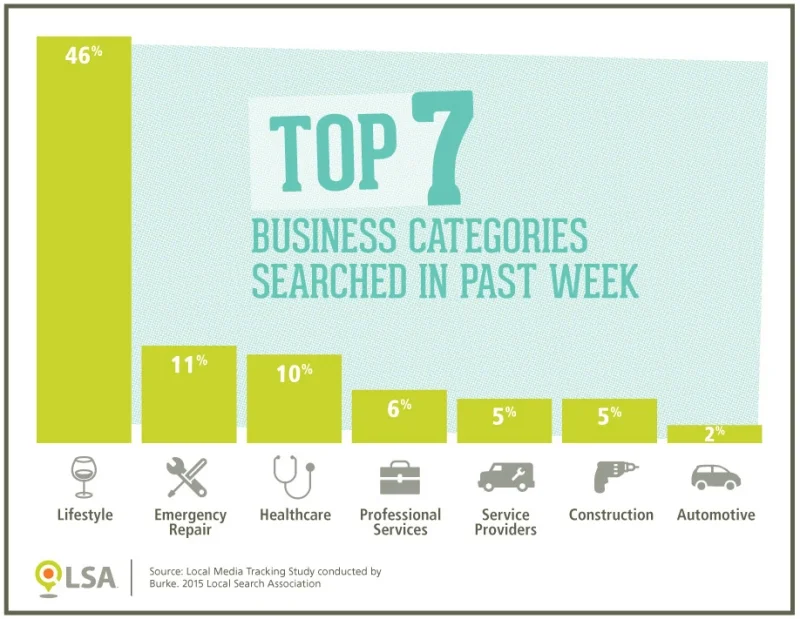 Based on a study of over 8,000 consumer respondents, LSA recently released an infographic highlighting the top 142 business categories that consumers searched for in the past week. The graphic above rolls up that more specific data into broader categories, offering some interesting insights.