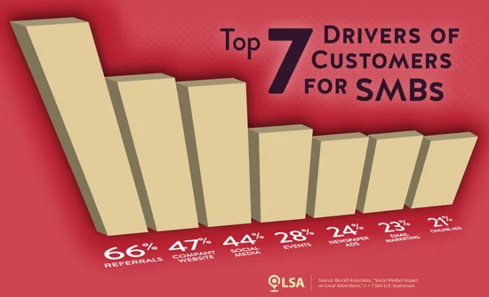 According to a new study, the top channels were grouped into three clusters. Referrals were alone at the top with 66% of SMBs saying they are a top driver of new business. The second cluster featured company websites (47%) and social media (44%). The third cluster featured events (28%), newspaper ads (24%), email marketing (23%) and online ads (21%).