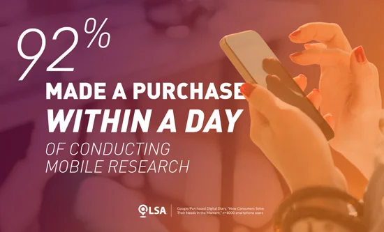 According to a new Google study, 92% of people who researched a product/service on mobile made a purchase within a day and 76% visited a related business within a day. Beyond the device, search was the most used source when conducting this research and 87% said they turned to search first.