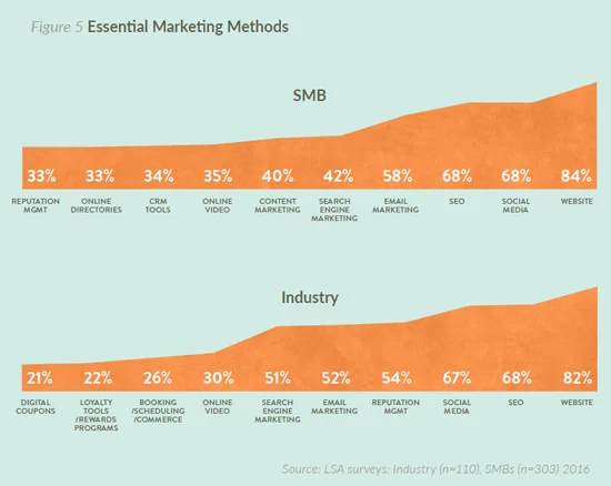 SEO, websites and social media were seen as the most essential channels by both groups. The largest discrepancy was "reputation management": 54% of industry respondents found it to be “essential,” but only 33% of SMBs agreed. Surprisingly, SMBs valued content marketing much more highly than media sellers.