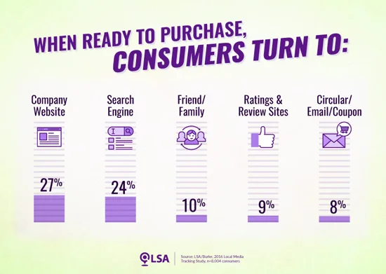According to a new LSA study, 27% of consumers turn to company websites when they are ready to buy, 24% turn to search engines and 9% utilize rating and review sites. In total, 72% of consumers turn to a digital channels when ready to buy, while 28% turn to offline or traditional channels like friends/family, newspapers, circulars, etc.